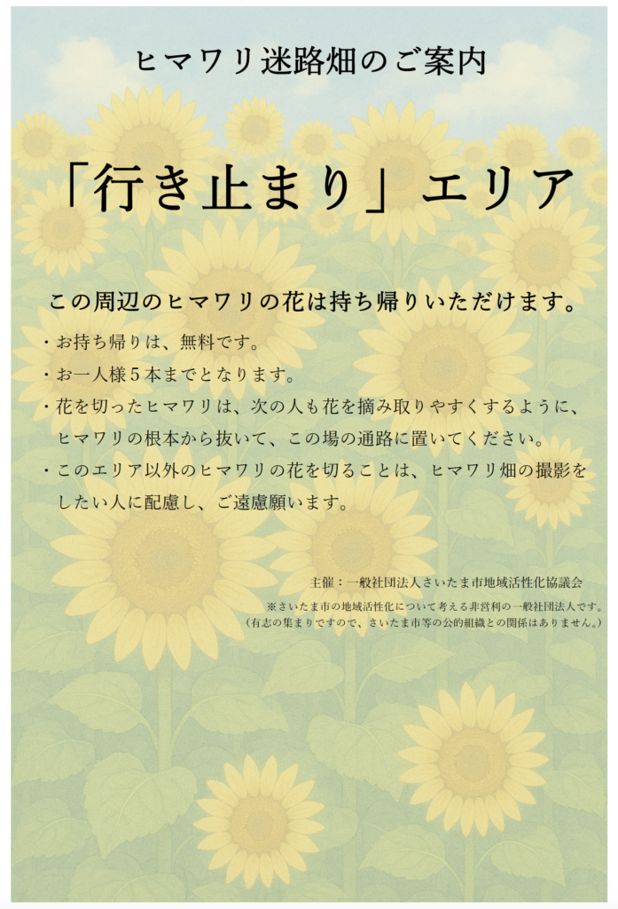 ・迷路の「出口」付近の奥側(ビル群側)の「行き止まり」以外の場所のヒマワリの花を切ることは、ヒマワリ畑の撮影をしたい人に配慮し、ご遠慮願います。