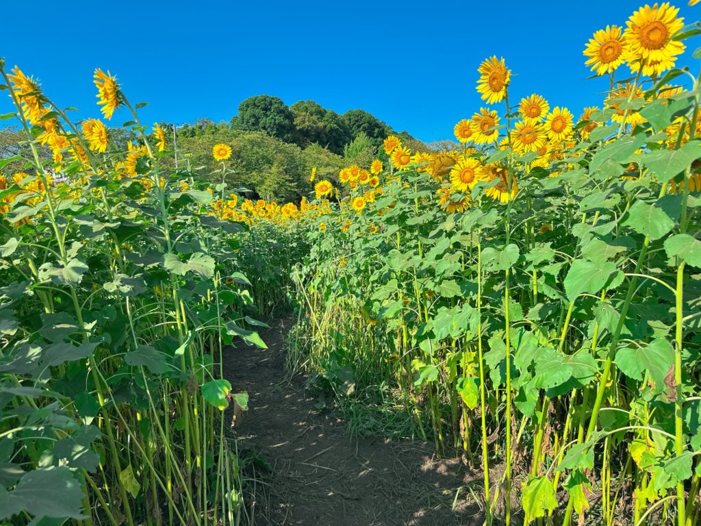・通路側に倒れ掛かってしまっているヒマワリは根本から抜いていただき、花を切って持って帰っていただけます。抜いたヒマワリの茎はそのまま通路に置いてください。